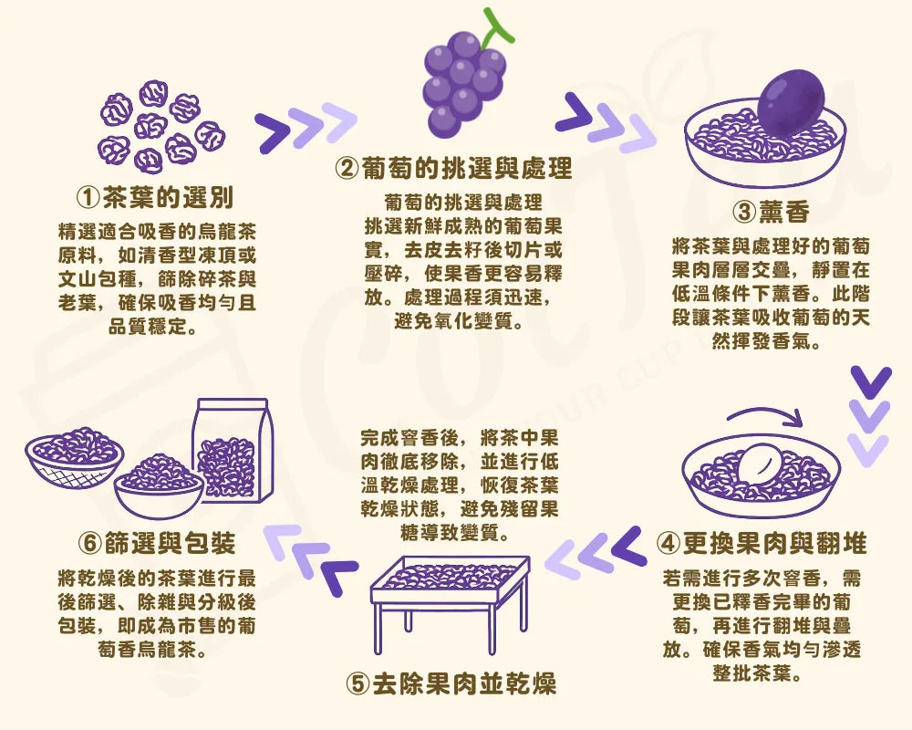 - 🍇 真果香・非香精:採「窨製法」製成,無任何人工香料添加
