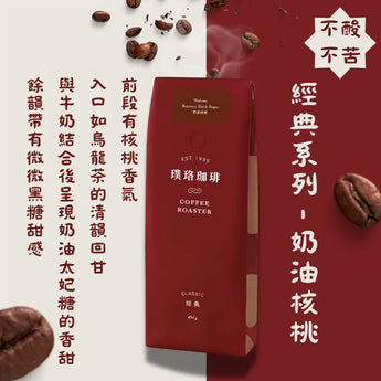 "Classic - Butter Walnut Coffee Beans 454g" is a blend of Brazil Cerrado × Guatemala SHB, presented in a medium-dark roast setting. The primary cup profile features roasted nuts, walnut notes, and sweet buttery caramel aromas. The overall profile is low-stimulation, smooth, and rounded, positioned as a highly drinkable daily blend meant to be enjoyed "every day." When milk, oat milk, or soy milk is added, the sweetness and buttery notes are easily amplified.